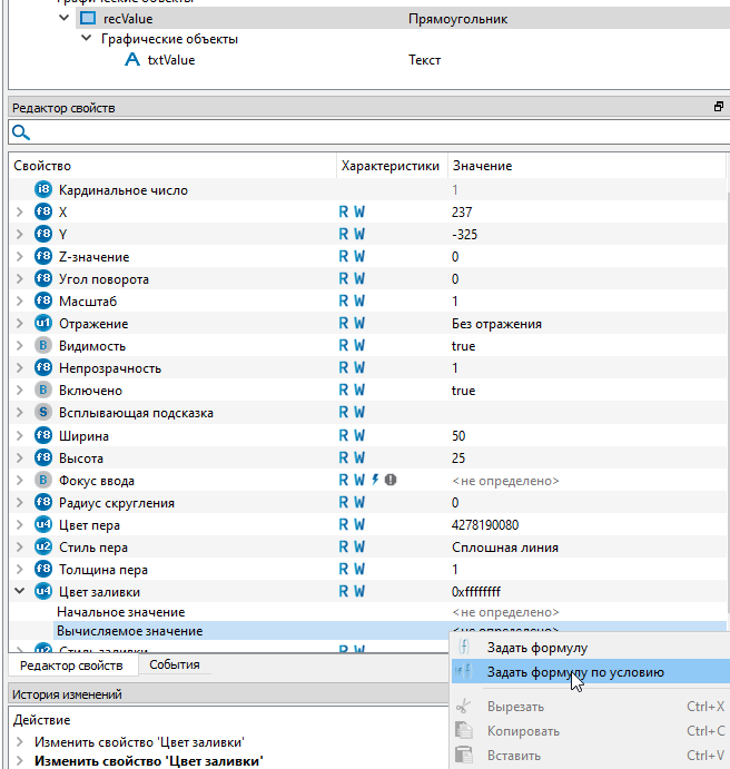 19. Задайте цветовую раскраску заливки типа "recValue" в завистимости от качества выходного сигнала "VALUE". Для этого раскройте крыжик у свойства "Цвет заливки" и нажмите правой кнопкой мыши по строке "Вычисляемое значение". Из контекстного меню выберите команду "Задать формулу по условию".