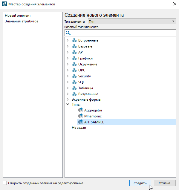 2. В мастере создания элементов раскройте вкладку "Типы" и выберите базовый тип элемента "AI1_SAMPLE". Нажмите кнопку "Создать".