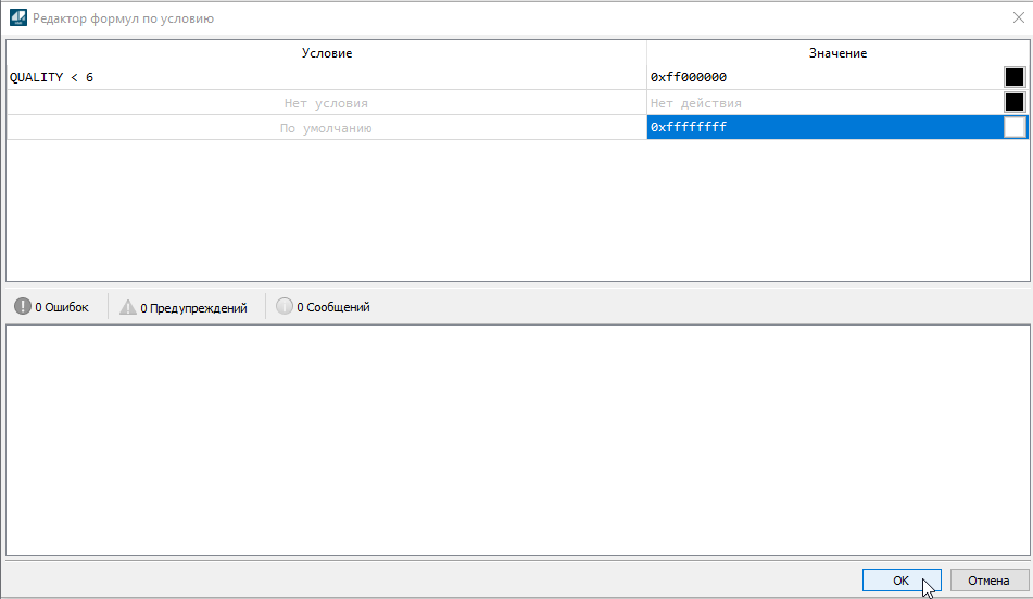 20. Нажмите кнопку "Редактировать..." . В появившемся окне откроется таблица с двумя столбцами "Условие" и "Значение". Соответственно, в столбец условие мы запишем условие для переменной "QUALITY" типа "int4", а в столбец значение запишем значение цвета. Например, при значении переменной QUALITY меньше 6 цвет заливки становится черным, а по умолчанию белый. После задания условий нажмите кнопку "ОК".