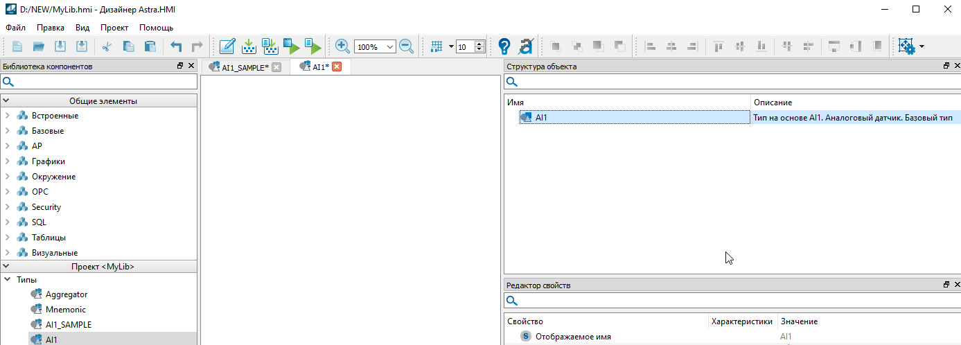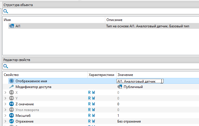 5. Выделите тип "AI1" кликнув по нему. В окне "Редактор свойств" измените значение свойства "Модификатор доступа" на "Публичный" и установите в свойстве "Отображаемое имя" значение "AI1. Аналоговый датчик". Модификатор доступа отвечает за доступность(видимость) тех или иных объектов после добавления библиотеки в проект.
