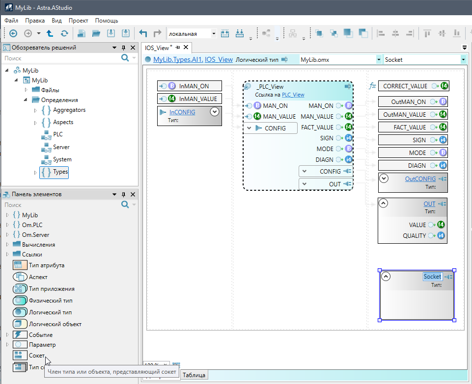 1. Перенесите элемент "Сокет" на рабочую область из панели элементов.