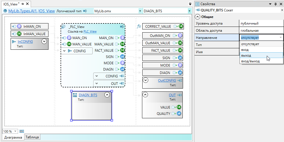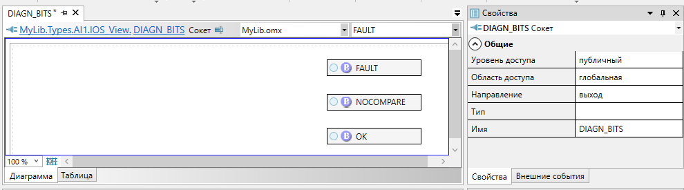 2. Выделите сокет и в окне "Свойства" укажите имя "DIAGN_BITS" и направление "выход". Данный сокет будет отвечать за отдельные состояния диагноза канала.