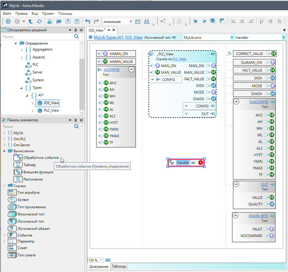 5. Вернитесь в представление "IOS_View" типа и добавьте элемент "Обработчик события" из раздела "Вычисления" панели элементов.