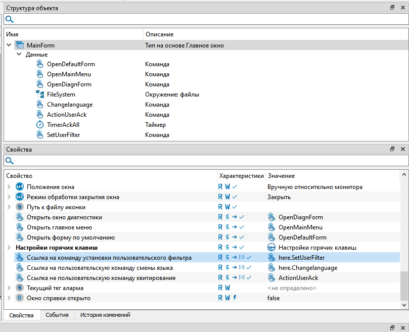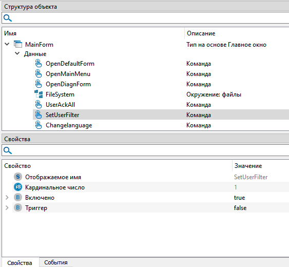 10. В свойстве "Ссылка на команду установки пользовательского фильтра" Главного окна необходимо сослаться на ранее созданную команду "SetUserFilter".