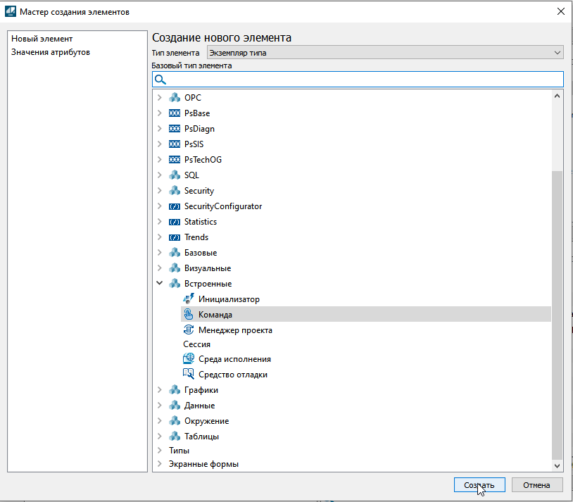 2. Создайте экземпляр типа команда в структуре объектов при помощи мастера создания элементов.