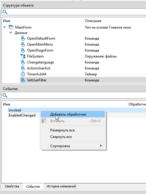 7. Выделите тип формы "Главное окно" в структуре объектов и перейдите на вкладку "События".