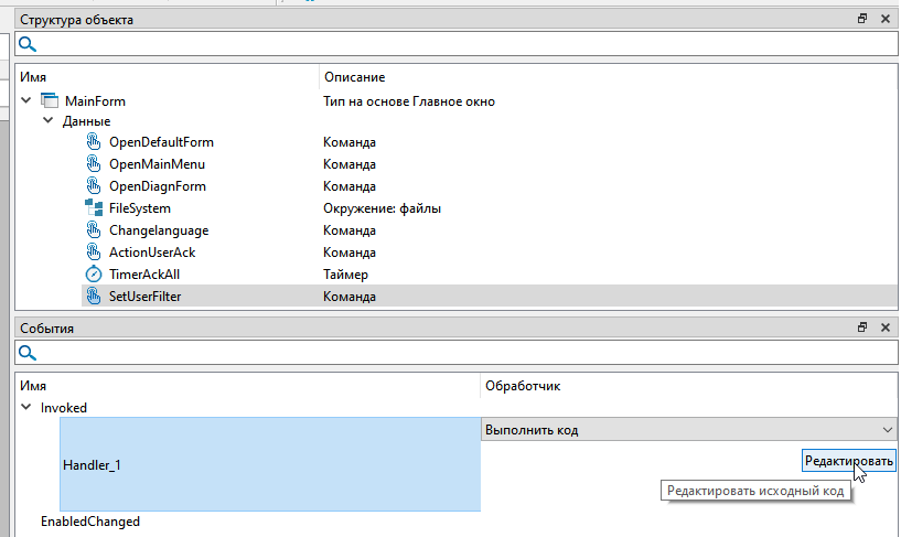 5. Укажите тип обработчика "Выполнить код" и нажмите кнопку "Редактировать".