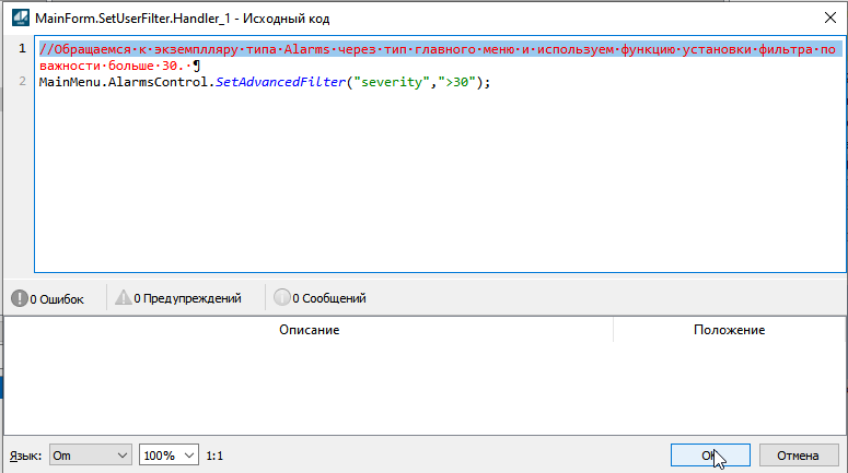 Аналогичным образом можно задавать пользовательский фильтр по подписке для экземпляра AlarmsControl. Более подробную информацию про пользовательский фильтр можно найти в документе "Разработка ППО. Руководство пользователя".