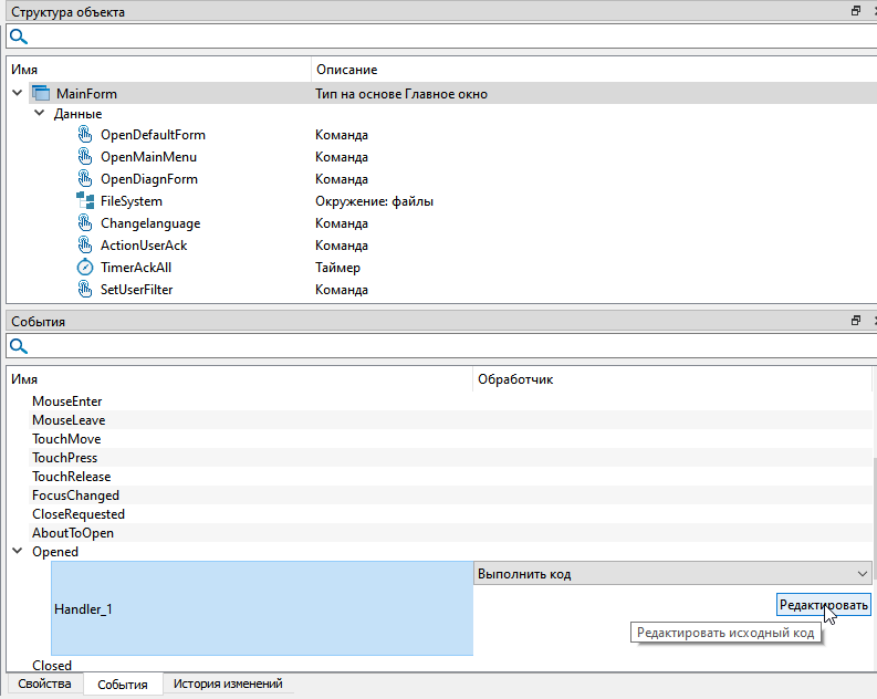 8. Для события Opened Добавьте обработчик типа "Выполнить код" и нажмите кнопку "Редактировать".