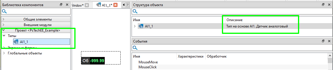 12. В области «Типы» будет создан объект на основе аналогового датчика.
