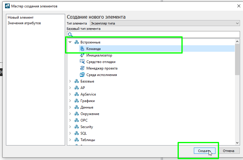 15. В мастере создания элементов выберите из вкладки "Встроенные" тип "Команда" и нажмите кнопку "Создать".