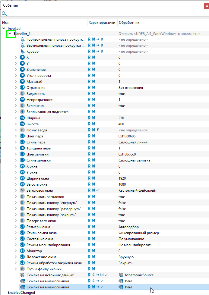 20. Раскройте свойства обработчика нажав на серую стрелку и заполните свойства также, как на скриншоте: