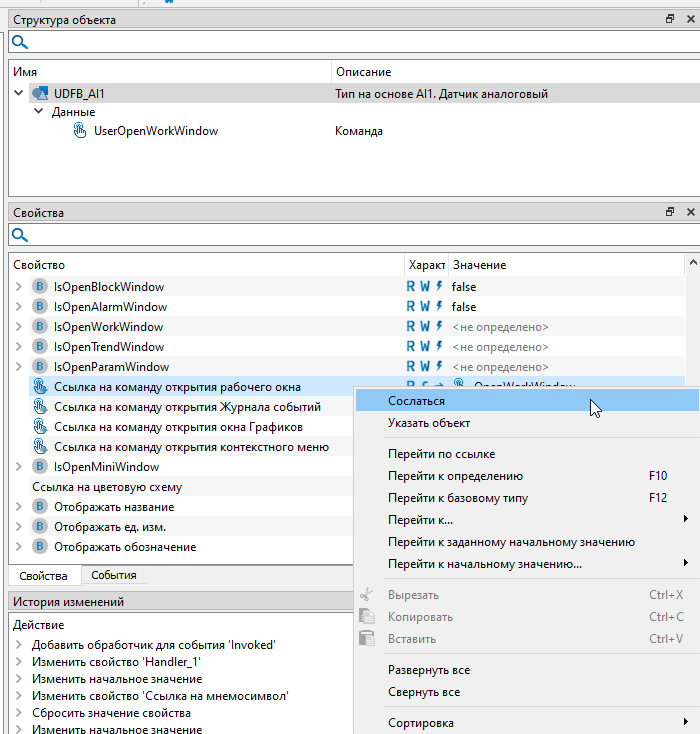 22. Кликните правой кнопкой мыши по значению свойства "Ссылка на команду открытия рабочего окна" и выберите команду "Сослаться".