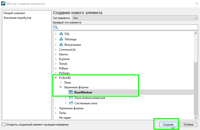 3. Выберите экранную форму BaseWindow и нажмите кнопку "Создать".