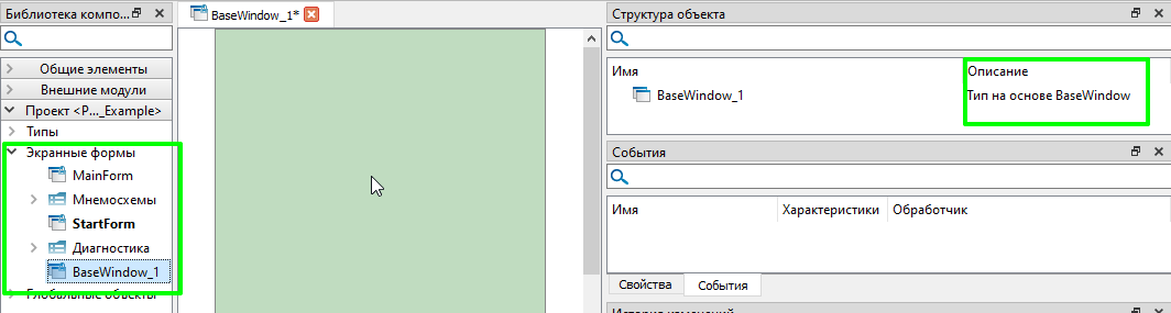 4. В области «Экранные формы» будет создана форма на основе BaseWindow.