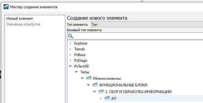9. В открывшемся окне в выпадающем списке «Тип элемента» выберите "Тип".