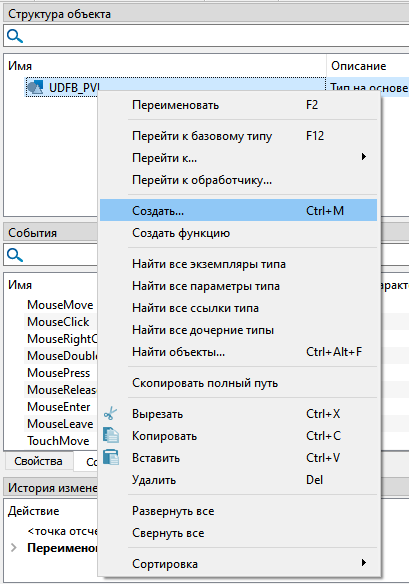 14. Откройте редактор типа и создайте команду для открытия кастомного фейсплейта. Вызовите контекстное меню кликнув правой кнопкой мыши по датчику в структуре объектов и выберите команду "Создать".