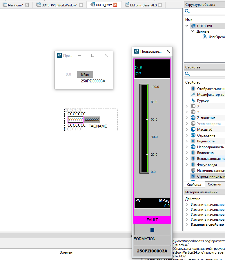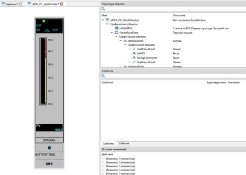6. Откройте редактор формы и создайте визуальное представление кастомного фейсплета. В качестве примера, переделаем стандартный фейсплейт функционального блока индикатора входа PVI. При помощи визуальных элементов сформируем несколько иное отображение фейсплейта аналогового датчика.