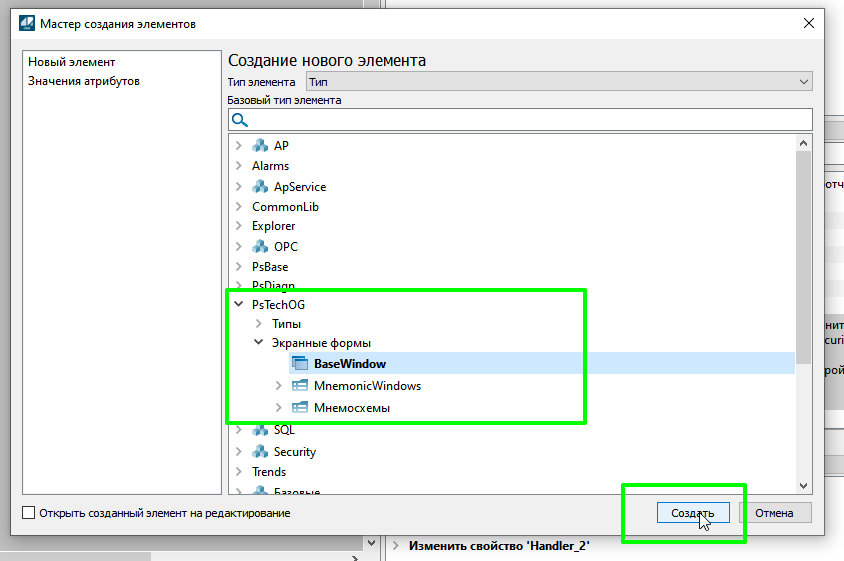 3. Выберите экранную форму BaseWindow и нажмите кнопку "Создать".