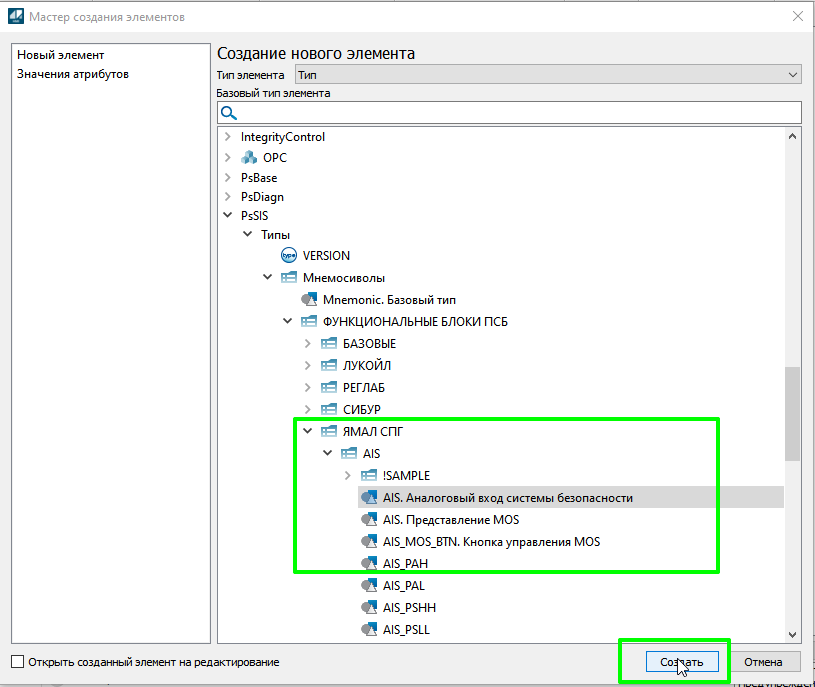 9. В открывшемся окне в выпадающем списке «Тип элемента» выберите "Тип".