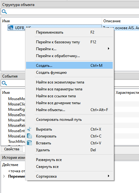 14. Откройте редактор типа и создайте команду для открытия кастомного фейсплейта. Вызовите контекстное меню кликнув правой кнопкой мыши по датчику в структуре объектов и выберите команду "Создать".