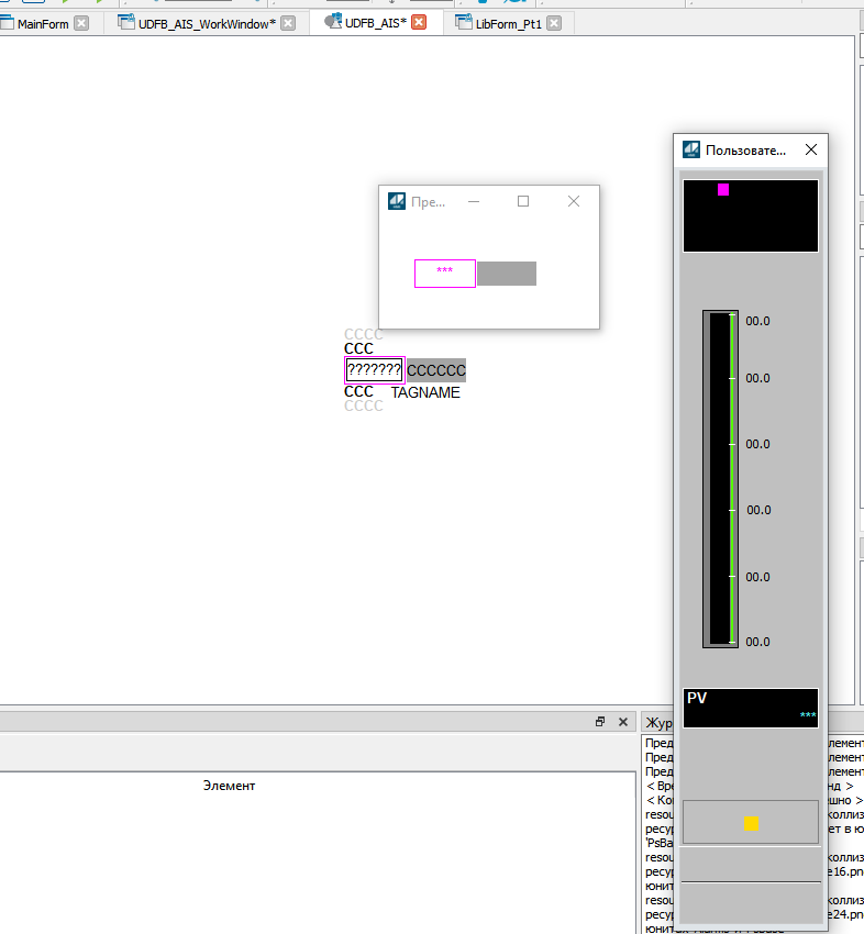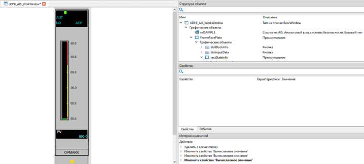 6. Откройте редактор формы и создайте визуальное представление кастомного фейсплета. В качестве примера, переделаем стандартный фейсплейт функционального блока аналогового входа системы безопасности AIS. При помощи визуальных элементов сформируем несколько иное отображение фейсплейта аналогового входа системы безопасности.
