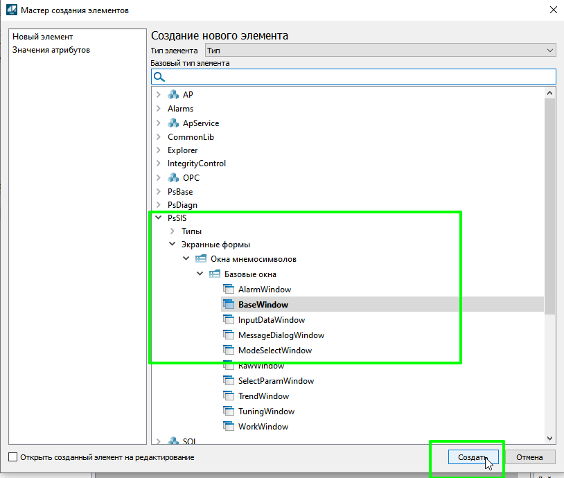3. Выберите экранную форму BaseWindow и нажмите кнопку "Создать".