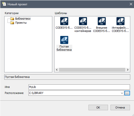 2. В открывшемся диалоговом окне выберите категорию "Библиотеки", шаблон "Пустая библиотека", задайте название и каталог. Нажмите кнопку "ОК".