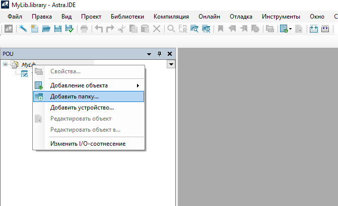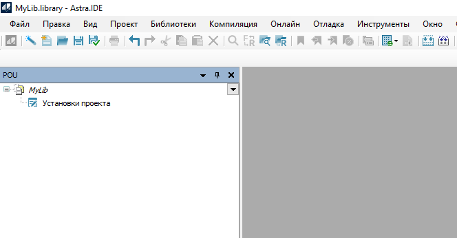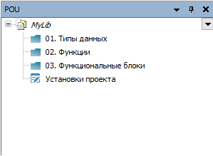 3. Будет создан пустой шаблон библиотеки. Перейдите во вкладку "POU".