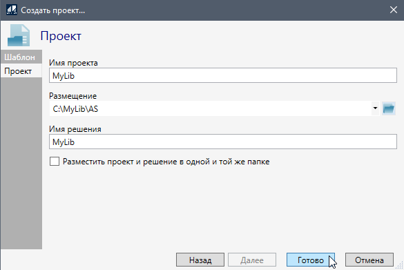 4. Заполните поля "Имя проекта", "Имя решения" и выберите каталог библиотеки. Нажмите кнопку "Готово".