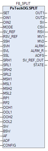 Блок разделения сигналов управления (SPLIT) может разделять сигналы управляющего выхода первичного контура управления на два адресата выхода через переключатель распределения сигналов. Этот блок может использоваться в контурах, в которых сигнал первичного контура распределяется на несколько вторичных контуров управления с различными диапазонами работы.