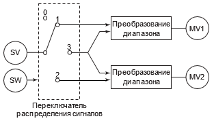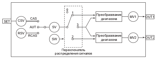 управляющий выход (MV), называется «действием управляющего выхода». Для блока разделения сигналов управления (SPLIT) доступен только «позиционный тип» действия управляющего выхода. Результат расчета управляющего выхода, соответствующий позиции переключателя распределения сигнала, выводится как управляющий выход (MV).