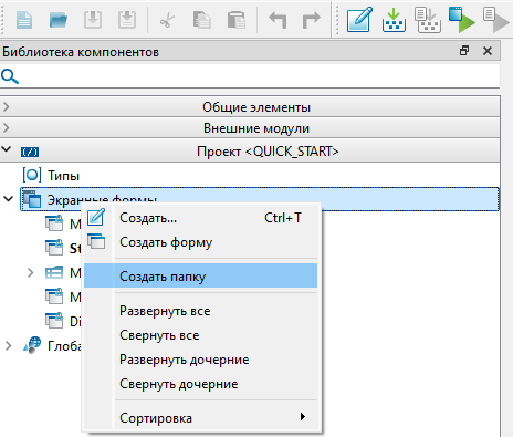 Чтобы создать папку, кликните правой кнопкой мыши по вкладке экранные формы и из контекстного меню выберите команду "Создать папку".