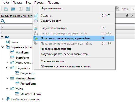 2. Выберите команду "Проект" → "Показать главную форму в рантайме" или нажмите клавишу "F9".