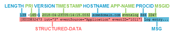 LENGTH <PRI>VERSION TIMESTAMP HOSTNAME APPNAME PROCID MSGID [STRUCTURED-DATA] MSG