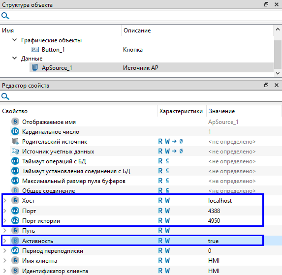 1. Добавьте компонент Источник AP. Задайте значения в свойствах Хост, Порт, Порт истории (если планируете запрашивать исторические события), Активность.