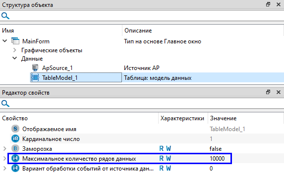 2. Добавьте компонент Таблица: модель данных. Укажите максимальное число строк таблицы в свойстве Максимальное количество рядов данных.