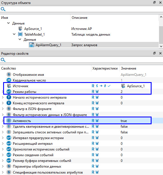 3. Добавьте компонент Запрос алармов дочерним компоненту Таблица: модель данных. Укажите источник данных в свойстве Источник, задайте режим работы компонента в зависимости от вида запрашиваемых событий (1 - исторические события, 2 - оперативные события) и активируйте компонент в свойстве Активность.
