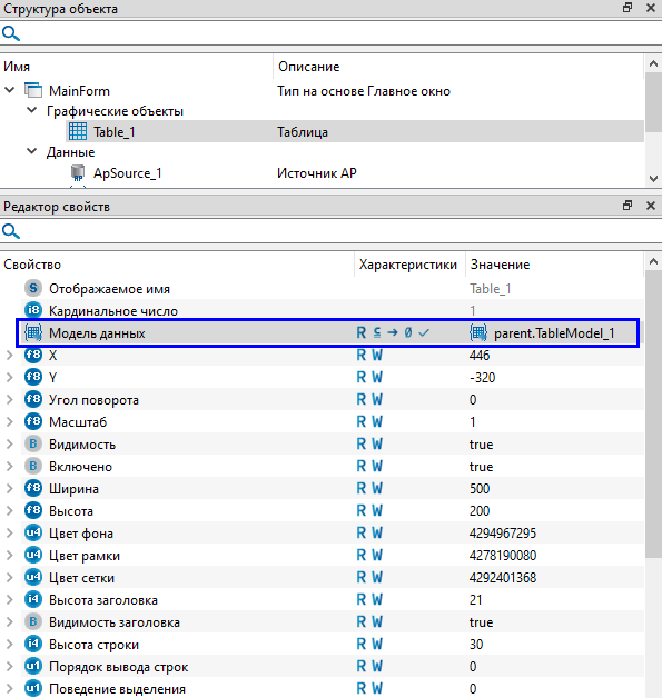 Чтобы визуализировать данные из таблицы модели, добавьте на экранную форму компонент Таблица. В свойстве Модель данных свяжите таблицу с моделью данных, значения которой будут визуализироваться.