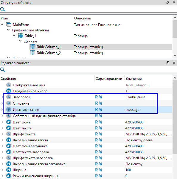 Вы можете настроить отображение в таблице на форме всех данных модели либо только отдельных столбцов. Добавьте компоненту Таблица дочерние компоненты Таблица: столбец. Для каждого столбца графической таблицы (свойство Идентификатор) запишите идентификатор столбца таблицы в модели данных. Идентификатор позволяет указать столбец, из которого в графическую таблицу будут подгружаться данные.