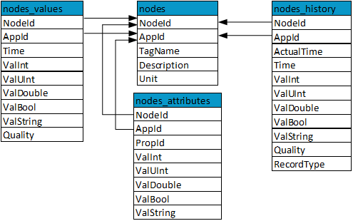 В таблицах nodes_values, nodes_history и nodes_attributes поля NodeId и AppId являются внешними ключами и ссылаются на таблицу nodes.