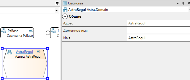 2. Выберите добавленный элемент "Astra.Domain" и в свойстве "Адрес" укажите значение "AstraRegul".