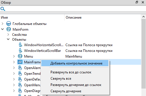 2. Перейдите в окно Обзор (появляется только при наличии запущенной на исполнение формы), выберите контролируемый объект или свойство, вызовите контекстное меню и выполните команду Добавить контрольное значение.