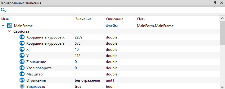3. В окне Контрольные значения (появляется только при наличии запущенной на исполнение формы) отображаются текущие значения свойств выбранного объекта.