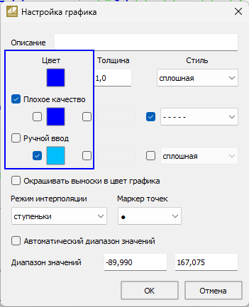 Чтобы настроить цвет линии определенного графика, двойным щелчком по сигналу в легенде откройте окно Настройка графика и выберите Цвет линии соответствующего режима. Чтобы выбранная настройка применилась, установите соответствующий флаг активности.
