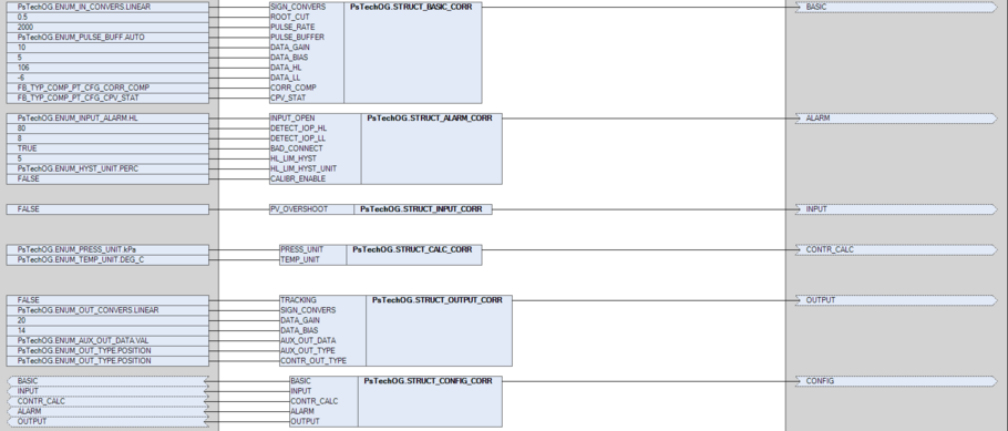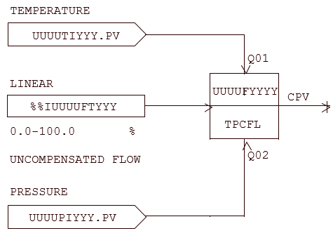 Измерения температуры, давления и расхода будут являться входными сигналами для блока компенсации. Коррекция температуры и давления будет осуществляться с помощью стандартного расчетного блока TPCFL. Формула для компенсации расхода запрограммирована в этом блоке.