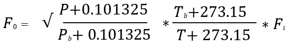 При компенсации температуры и давления выполняются поправочные расчеты как температуры, так и давления. Ниже приведена формула для вычисления поправок при измеренном расходе Fi, эталонном давлении Pb, эталонной температуре Tb, измеренном давлении P, и когда единицей измерения давления является МПа.