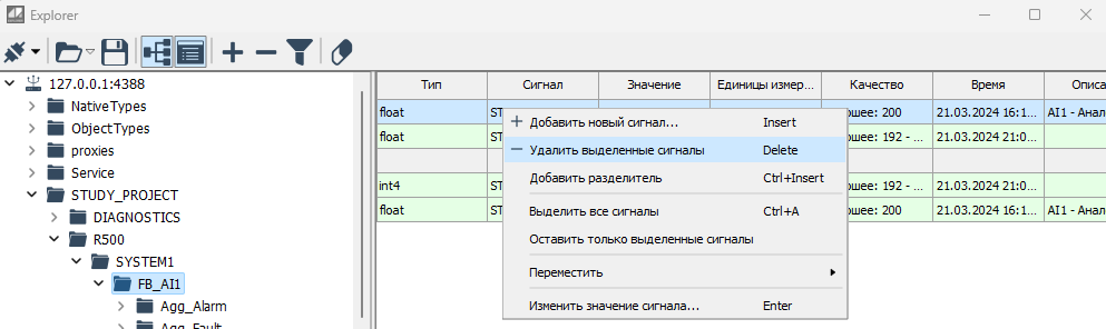 3.12.2.2.2.2. Удаление сигналов Чтобы удалить сигнал из таблицы инспектора, выберите строку сигнала и нажмите Delete, или щелкните ПКМ и выберите Удалить выделенные сигналы в выпадающем меню.