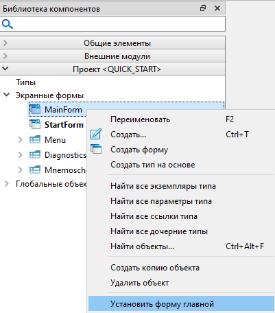 Чтобы указать главную форму в проекте, вызовите контекстное меню нужной экранной формы и выберите команду Установить форму главной.