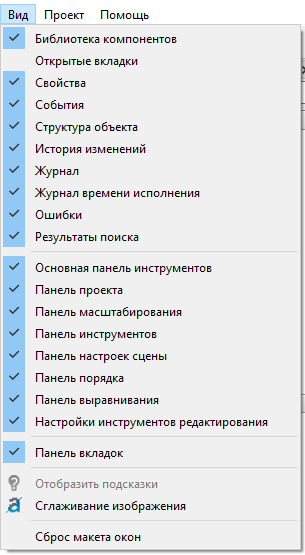 Дизайнер Astra.HMI позволяет пользователю гибко настраивать области пользовательского интерфейса. Области можно скрывать, отображать, перемещать внутри области Дизайнера Astra.HMI, выносить за пределы Дизайнера Astra.HMI, а также изменять размеры отображаемых областей. Настройки среды разработки сохраняются после перезапуска программы.